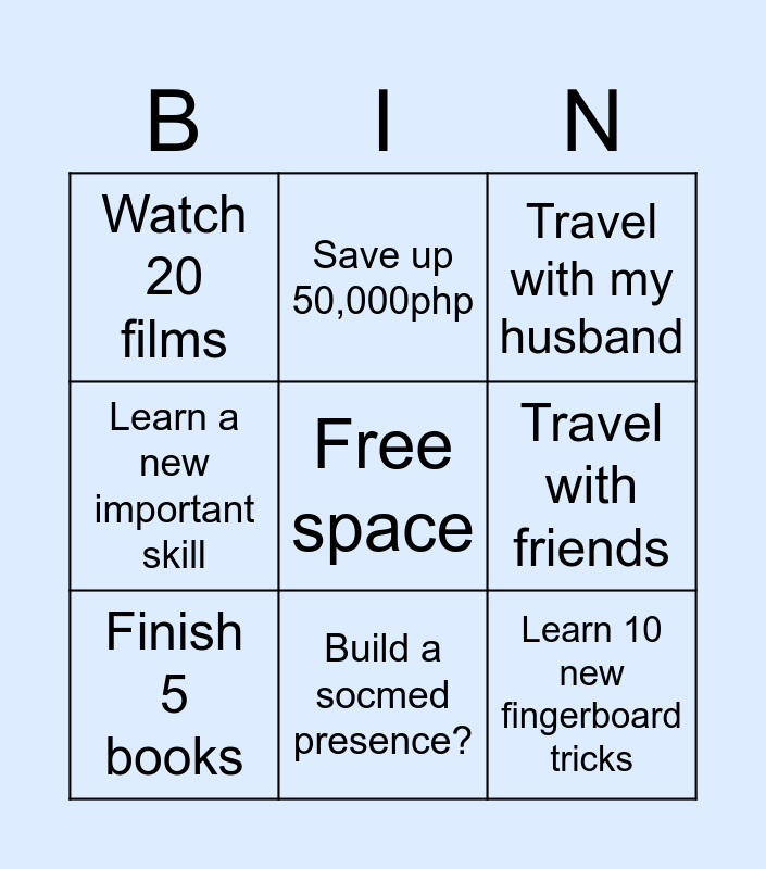 This bingo card has a free space and 8 words: Travel with friends, Travel with my husband, Save up 50,000php, Finish 5 books, Watch 20 films, Learn 10 new fingerboard tricks, Learn a new important skill and Build a socmed presence?.