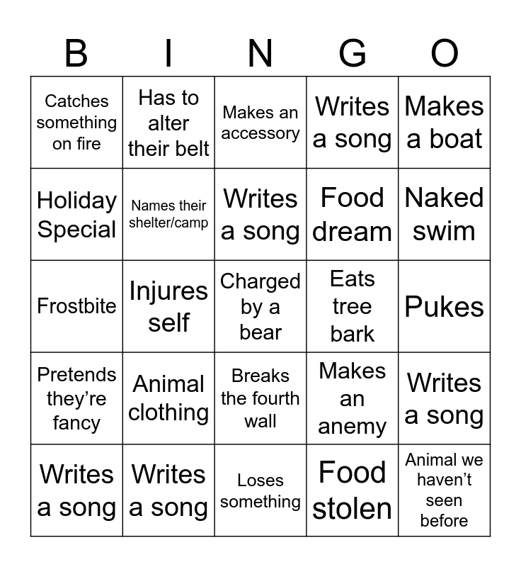 This bingo card has 30 words: Writes a song, Loses a fish, Injures self, Shelter gets destroyed, Catches something on fire, Makes an accessory, Names their shelter/camp, Breaks the fourth wall, Eats tree bark, Loses something, Pukes, Charged by a bear, Food stolen, Animal we haven’t seen before, Naked swim, References someone from a previous season, Makes an anemy, Pretends they’re fancy, Animal clothing, Makes a boat, Frostbite, Makes an herbal medicine, Has to alter their belt, Food dream, Holiday Special, Writes a song, Writes a song, Writes a song, Writes a song and Writes a song.