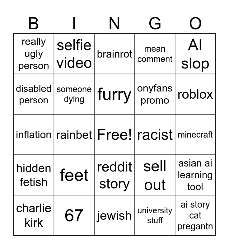 This bingo card has a free space and 24 words: feet, 67, furry, charlie kirk, AI slop, really ugly person, disabled person, selfie video, racist, reddit story, onyfans promo, inflation, sell out, asian ai learning tool, someone dying, university stuff, minecraft, brainrot, roblox, rainbet, ai story cat pregantn, hidden fetish, mean comment and jewish.