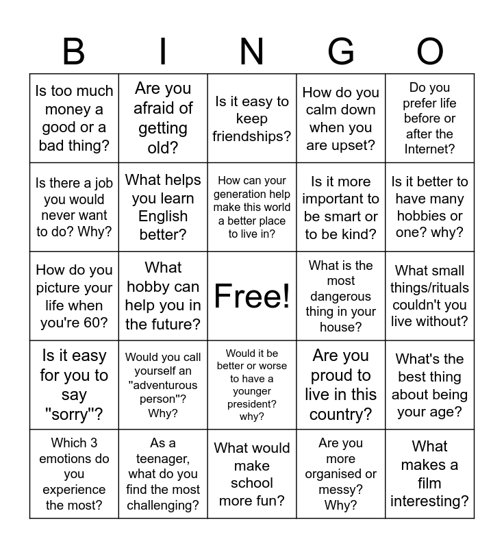 This bingo card has a free space and 24 words: Would you call yourself an ''adventurous person''? Why?, As a teenager, what do you find the most challenging?, How can your generation help make this world a better place to live in?, Which 3 emotions do you experience the most?, Do you prefer life before or after the Internet?, Is too much money a good or a bad thing?, Is there a job you would never want to do? Why?, Are you afraid of getting old?, What is the most dangerous thing in your house?, Would it be better or worse to have a younger president? why?, Is it more important to be smart or to be kind?, How do you picture your life when you're 60?, Are you proud to live in this country?, What's the best thing about being your age?, What helps you learn English better?, Are you more organised or messy? Why?, What small things/rituals couldn't you live without?, Is it easy to keep friendships?, Is it better to have many hobbies or one? why?, What hobby can help you in the future?, What makes a film interesting?, Is it easy for you to say ''sorry''?, How do you calm down when you are upset? and What would make school more fun?.