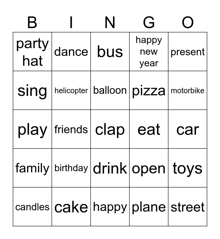 This bingo card has a free space and 24 words: birthday, cake, balloon, candles, present, party hat, sing, dance, eat, drink, pizza, play, open, toys, helicopter, plane, car, bus, motorbike, friends, street, family, happy new year and happy.