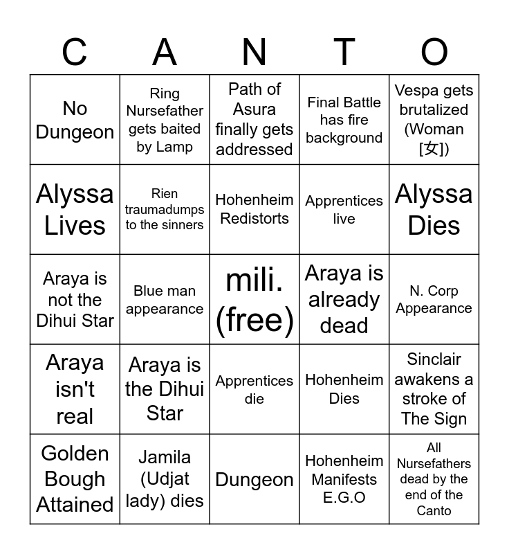 This bingo card has a free space and 24 words: Araya is the Dihui Star, Jamila (Udjat lady) dies, Hohenheim Redistorts, Golden Bough Attained, Vespa gets brutalized (Woman [女]), No Dungeon, Alyssa Lives, Ring Nursefather gets baited by Lamp, Araya is already dead, Apprentices die, Apprentices live, Araya is not the Dihui Star, Hohenheim Dies, Sinclair awakens a stroke of The Sign, Rien traumadumps to the sinners, Hohenheim Manifests E.G.O, N. Corp Appearance, Path of Asura finally gets addressed, Alyssa Dies, Blue man appearance, All Nursefathers dead by the end of the Canto, Araya isn't real, Final Battle has fire background and Dungeon.