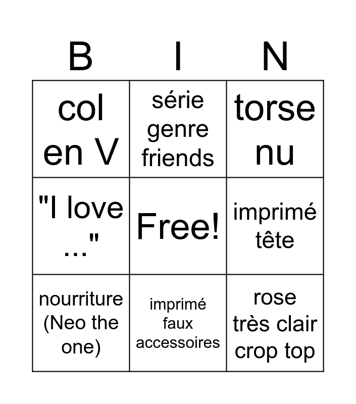 This bingo card has a free space and 8 words: imprimé tête, torse nu, série genre friends, nourriture (Neo the one), col en V, rose très clair crop top, "I love ..." and imprimé faux accessoires.