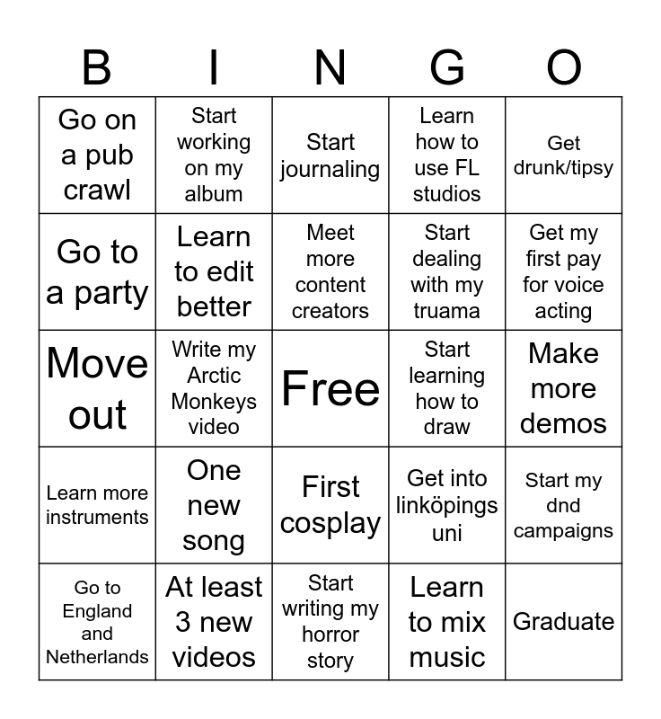 This bingo card has a free space and 24 words: One new song, At least 3 new videos, Meet more content creators, Go to England and Netherlands, Get drunk/tipsy, Go on a pub crawl, Go to a party, Start working on my album, Start learning how to draw, First cosplay, Start dealing with my truama, Move out, Get into linköpings uni, Start my dnd campaigns, Learn to edit better, Learn to mix music, Make more demos, Start journaling, Get my first pay for voice acting, Write my Arctic Monkeys video, Graduate, Learn more instruments, Learn how to use FL studios and Start writing my horror story.