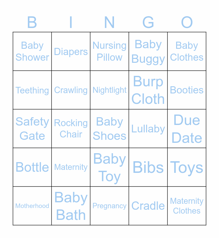 This bingo card has a free space and 70 words: Teething, Due Date, Baby Registry, Baby Shower Favors, Baby Bath, Baby Bottle, Baby Buggy, Sterilizer, Baby Clothes, Baby Food, Toys, Bath-Time, Baby Shower, Nursing Pillow, Baby Sitter, Rocking Chair, Baby Toy, Burp Cloth, Bassinet, Bottle, Lullaby, Bibs, Booties, Bouncer Seat, Cravings, Car Seat, Changing Table, Cloth Diaper, Cradle, Crib, Diapers, Diaper Bag, Blanket, Feeding, Ultrasound, Potty Training, High Chair, Infant Carrier, Stroller, Teething, Blocks, Maternity, Maternity Clothes, Milk, Mommy, Crawling, Motherhood, Nursery, Nursery Rhyme, Onesies, Pacifier, Parent, Playpen, Post-Natal, Pregnancy, Pre-Natal, Nightlight, Rattle, Receiving Blanket, Rompers, Safety Gate, Safety Pin, Shower Cake, Toddler, Gender Reveal, Humidifier, Ointment, Wipes, Breast Feeding and Daddy.