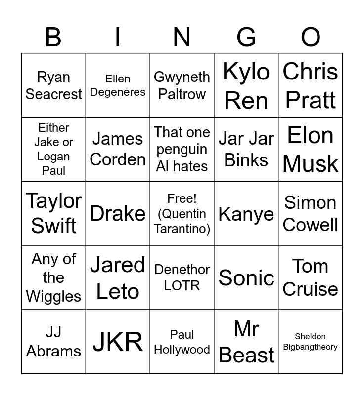This bingo card has a free space and 24 words: Jared Leto, JKR, That one penguin Al hates, JJ Abrams, Chris Pratt, Ryan Seacrest, Either Jake or Logan Paul, Ellen Degeneres, Kanye, Denethor LOTR, Jar Jar Binks, Taylor Swift, Sonic, Tom Cruise, James Corden, Mr Beast, Simon Cowell, Gwyneth Paltrow, Elon Musk, Drake, Sheldon Bigbangtheory, Any of the Wiggles, Kylo Ren and Paul Hollywood.