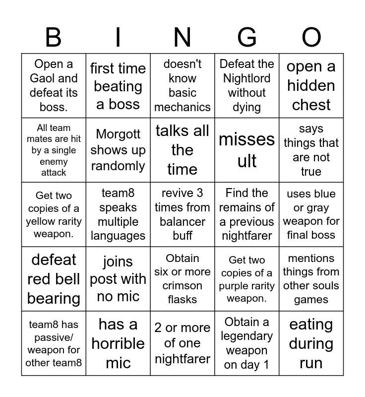 This bingo card has 35 words: Team mate refuses to skip cutscene, Map has no damage type camp for Nightlord's specific weakness, Make a deal with the libra, Morgott shows up randomly, Obtain six or more crimson flasks, Defeat the Nightlord without dying, All team mates are hit by a single enemy attack, Difficult boss is absolutely shredded by the team, talks all the time, is the goat, Get two copies of a yellow rarity weapon., open a hidden chest, has increase to health on relics, Complete a Shifting Earth event, Open a Gaol and defeat its boss., Find the remains of a previous nightfarer, Obtain a legendary weapon on day 1, team8 speaks multiple languages, defeat red bell bearing, revive 3 times from balancer buff, Get two copies of a purple rarity weapon., team8 has passive/ weapon for other team8, mentions things from other souls games, has a horrible mic, doesn't know basic mechanics, says things that are not true, eating during run, unfunny name "ingame", misses ult, uses blue or gray weapon for final boss, intoxicated gamer, 2 or more of one nightfarer, joins post with no mic, first time beating a boss and activates any power from midday bosses.