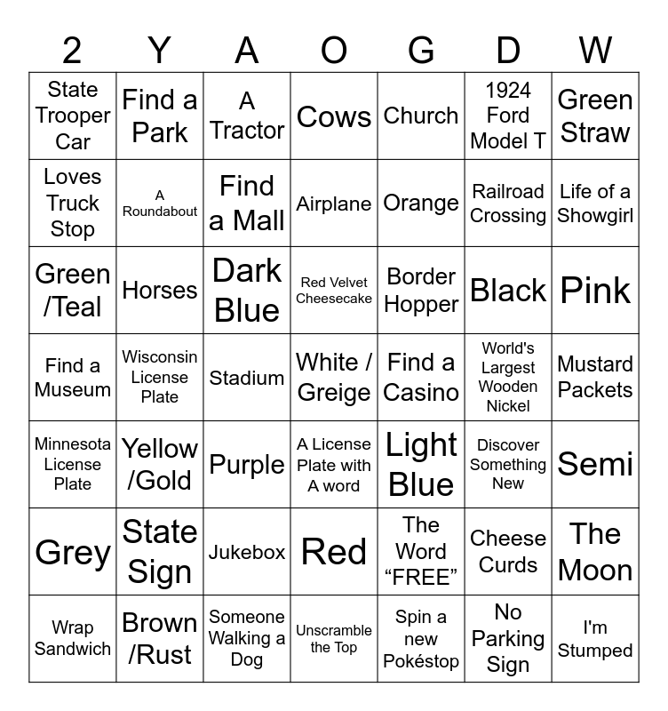 This bingo card has 51 words: Wrap Sandwich, Wisconsin License Plate, Jukebox, Red Velvet Cheesecake, Border Hopper, Cheese Curds, Green Straw, Find a barn, Horses, Stadium, Cows, Church, World's Largest Wooden Nickel, Mustard Packets, Minnesota License Plate, State Sign, A Tractor, Airplane, Spin a new Pokéstop, 1924 Ford Model T, Life of a Showgirl, Find a Museum, Find a Park, Find a Mall, Unscramble the Top, Find a Casino, Railroad Crossing, I'm Stumped, Loves Truck Stop, A Roundabout, Someone Walking a Dog, A License Plate with A word, The Word “FREE”, No Parking Sign, Semi, Green /Teal, Yellow /Gold, Purple, Red, Light Blue, Black, Pink, Grey, Brown /Rust, Dark Blue, White / Greige, Orange, Discover Something New, The Moon, State Trooper Car and I’m Stumped.