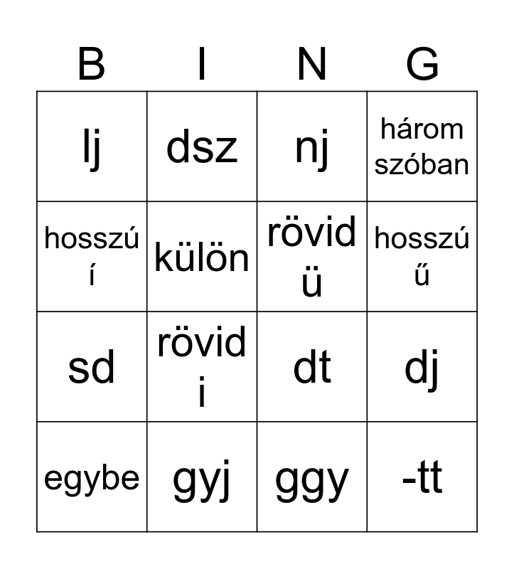 This bingo card has 16 words: gyj, dj, nj, lj, sd, dsz, dt, ggy, hosszú í, külön, egybe, három szóban, rövid i, hosszú ű, rövid ü and -tt.