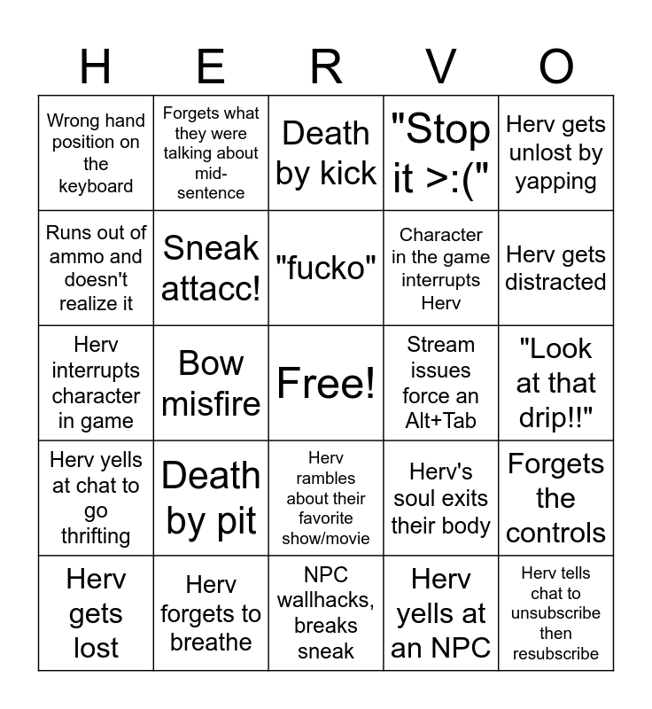 This bingo card has a free space and 24 words: Death by pit, Herv forgets to breathe, "fucko", Herv gets lost, Herv gets unlost by yapping, Wrong hand position on the keyboard, Runs out of ammo and doesn't realize it, Forgets what they were talking about mid-sentence, Stream issues force an Alt+Tab, Herv rambles about their favorite show/movie, Character in the game interrupts Herv, Herv interrupts character in game, Herv's soul exits their body, Forgets the controls, Sneak attacc!, Herv yells at an NPC, "Look at that drip!!", Death by kick, Herv gets distracted, Bow misfire, Herv tells chat to unsubscribe then resubscribe, Herv yells at chat to go thrifting, "Stop it >:(" and NPC wallhacks, breaks sneak.