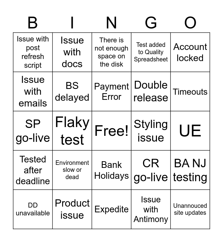 This bingo card has a free space and 24 words: Environment slow or dead, Product issue, Payment Error, DD unavailable, Account locked, Issue with post refresh script, Issue with emails, Issue with docs, Styling issue, Bank Holidays, Double release, SP go-live, CR go-live, BA NJ testing, BS delayed, Issue with Antimony, UE, There is not enough space on the disk, Timeouts, Flaky test, Unannouced site updates, Tested after deadline, Test added to Quality Spreadsheet and Expedite.