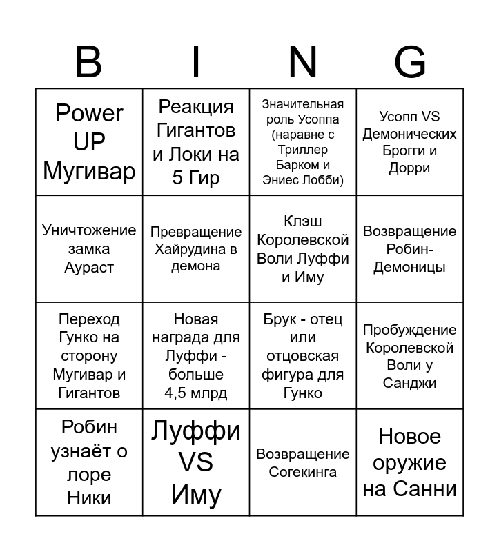 This bingo card has 16 words: Луффи VS Иму, Пробуждение Королевской Воли у Санджи, Значительная роль Усоппа (наравне с Триллер Барком и Эниес Лобби), Power UP Мугивар, Переход Гунко на сторону Мугивар и Гигантов, Реакция Гигантов и Локи на 5 Гир, Брук - отец или отцовская фигура для Гунко, Возвращение Согекинга, Уничтожение замка Аураст, Превращение Хайрудина в демона, Робин узнаёт о лоре Ники, Усопп VS Демонических Брогги и Дорри, Новая награда для Луффи - больше 4,5 млрд, Возвращение Робин-Демоницы, Клэш Королевской Воли Луффи и Иму and Новое оружие на Санни.