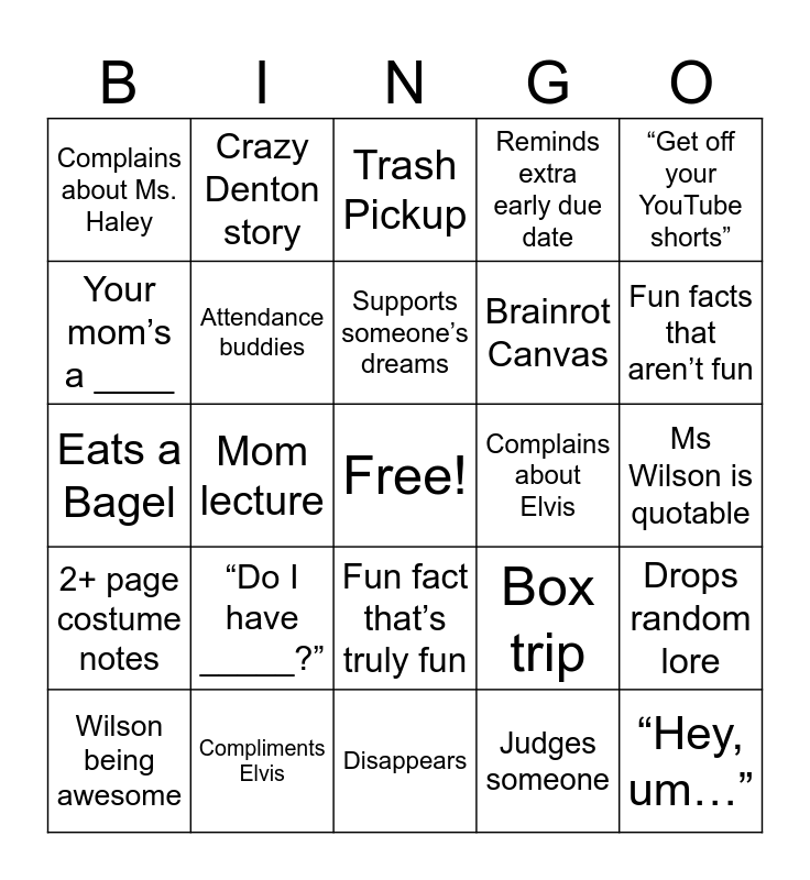 This bingo card has a free space and 24 words: “Do I have _____?”, Compliments Elvis, Supports someone’s dreams, Wilson being awesome, “Get off your YouTube shorts”, Complains about Ms. Haley, Your mom’s a ____, Crazy Denton story, Complains about Elvis, Fun fact that’s truly fun, Brainrot Canvas, Eats a Bagel, Box trip, Drops random lore, Attendance buddies, Judges someone, Ms Wilson is quotable, Trash Pickup, Fun facts that aren’t fun, Mom lecture, “Hey, um…”, 2+ page costume notes, Reminds extra early due date and Disappears.
