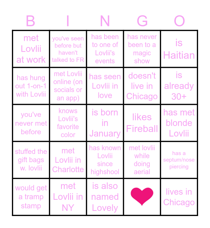 This bingo card has 1 images and 29 words: met Lovlii in NY, has pet Whispurr TheCat, knows Lovlii's favorite color, met Lovlii on a trip, met Lovlii at work, has been to one of Lovlii's events, met Lovlii online (on socials or an app), has known Lovlii since highshool, likes Fireball, is also named Lovely, has met blonde Lovlii, is born in January, lives in Chicago, is already 30+, is related to Lovlii, met lovlii while doing aerial, stuffed the gift bags w. lovlii, met Lovlii in Charlotte, is Haitian, you've never met before, met Lovlii her first year in Chicago, you've seen before but haven't talked to FR, doesn't live in Chicago, has hung out 1-on-1 with Lovlii, has never been to a magic show, has a septum/nose piercing, would get a tramp stamp, has seen Lovlii in love and met King Draco DaDragon.