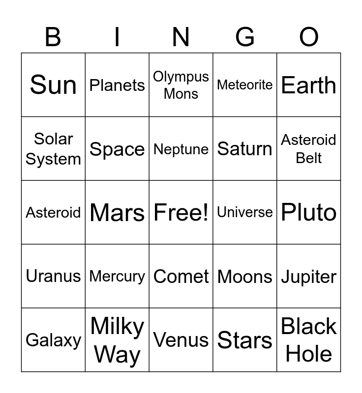 This bingo card has a free space and 24 words: Mercury, Milky Way, Neptune, Galaxy, Earth, Sun, Solar System, Planets, Universe, Comet, Saturn, Asteroid, Moons, Jupiter, Space, Stars, Pluto, Olympus Mons, Asteroid Belt, Mars, Black Hole, Uranus, Meteorite and Venus.