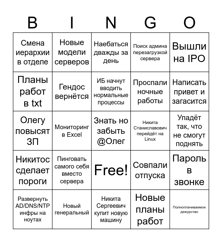 This bingo card has 26 words: Free!, Новые планы работ, ИБ начнут вводить нормальные процессы, Новый генеральный, Вышли на IPO, Смена иерархии в отделе, Планы работ в txt, Новые модели серверов, Упадёт так, что не смогут поднять, Совпали отпуска, Проспали ночные работы, Олегу повысят ЗП, Пароль в звонке, Развернуть AD/DNS/NTP инфры на ноутах, Мониторинг в Excel, Скинуть нерабочую ссылку на чат, Поиск админа перезагрузкой сервера, Никитос сделает пороги, Наебаться дважды за день, Знать но забыть @Олег, Написать привет и загасится, Никита Сергеевич купит новую машину, Никита Станиславович перейдёт на Linux, Пинговать самого себя вместо сервера, Гендос вернётся and Полноплачиваемое дежурство.
