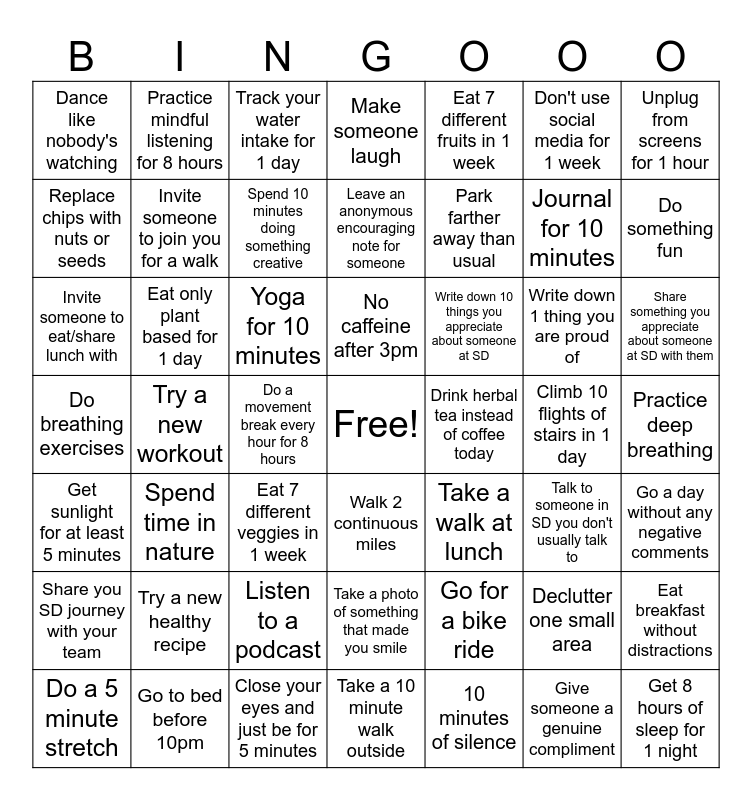 This bingo card has a free space and 48 words: Go for a bike ride, Journal for 10 minutes, Take a 10 minute walk outside, Try a new workout, Yoga for 10 minutes, Practice deep breathing, Practice mindful listening for 8 hours, Go to bed before 10pm, Don't use social media for 1 week, Walk 2 continuous miles, Unplug from screens for 1 hour, Make someone laugh, Write down 1 thing you are proud of, Write down 10 things you appreciate about someone at SD, Share you SD journey with your team, Climb 10 flights of stairs in 1 day, Replace chips with nuts or seeds, Do something fun, Declutter one small area, Eat 7 different fruits in 1 week, Park farther away than usual, Do a movement break every hour for 8 hours, Dance like nobody's watching, Invite someone to join you for a walk, Eat breakfast without distractions, Spend 10 minutes doing something creative, Share something you appreciate about someone at SD with them, Do a 5 minute stretch, No caffeine after 3pm, Eat only plant based for 1 day, Give someone a genuine compliment, Drink herbal tea instead of coffee today, Go a day without any negative comments, Try a new healthy recipe, Do breathing exercises, Take a walk at lunch, Talk to someone in SD you don't usually talk to, Invite someone to eat/share lunch with, Eat 7 different veggies in 1 week, Listen to a podcast, Get sunlight for at least 5 minutes, Get 8 hours of sleep for 1 night, Track your water intake for 1 day, Close your eyes and just be for 5 minutes, Leave an anonymous encouraging note for someone, Take a photo of something that made you smile, Spend time in nature and 10 minutes of silence.