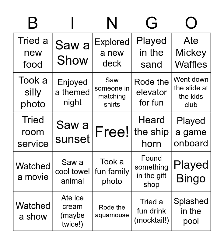 This bingo card has a free space and 24 words: Saw a cool towel animal, Ate ice cream (maybe twice!), Saw someone in matching shirts, Watched a show, Ate Mickey Waffles, Tried a new food, Took a silly photo, Saw a Show, Heard the ship horn, Took a fun family photo, Rode the elevator for fun, Tried room service, Found something in the gift shop, Played Bingo, Enjoyed a themed night, Tried a fun drink (mocktail!), Played a game onboard, Explored a new deck, Went down the slide at the kids club, Saw a sunset, Splashed in the pool, Watched a movie, Played in the sand and Rode the aquamouse.