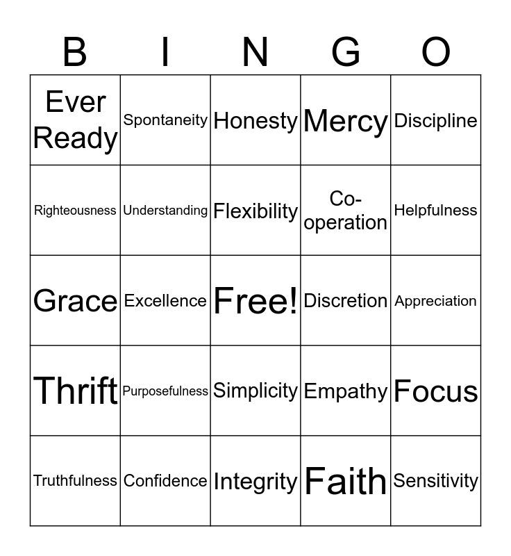 This bingo card has a free space and 100 words: Acceptance, Accountability, Appreciation, Authenticity, Benevolence, Bravery, Beauty, Caring, Charity, Clarity, Cleanliness, Commitment, Compassion, Confidence, Consideration, Contentment, Co-operation, Courage, Courtesy, Creativity, Dependability, Detachment, Determination, Diligence, Discernment, Discretion, Discipline, Empathy, Easiness, Enthusiasm, Excellence, Ever Ready, Far sighted, Big Hearted, Faith, Flexibility, Focus, Forgiveness, Fortitude, Friendliness, Generosity, Gentleness, Grace, Gratitude, Helpfulness, Honesty, Hope, Humility, Humour, Integrity, Impartiality, Innocence, Joyfulness, Justice, Kindness, Knowledge, Lightness, Love, Loyalty, Mercy, Moderation, Obedience, Openness, Orderliness, Patience, Peace, Perseverance, Persistence, Prudence, Punctuality, Purity, Purposefulness, Reliability, Resourcefulness, Respect, Responsibility, Restraint, Righteousness, Royalty, Selflessness, Self Sacrifice, Sensitivity, Silence, Simplicity, Sincerity, Spontaneity, Steadfastness, Strength, Sweetness, Thrift, Tolerance, Trust, Trustworthiness, Truthfulness, Understanding, Unity, Vitality, Wisdom, Wonder and Zeal.