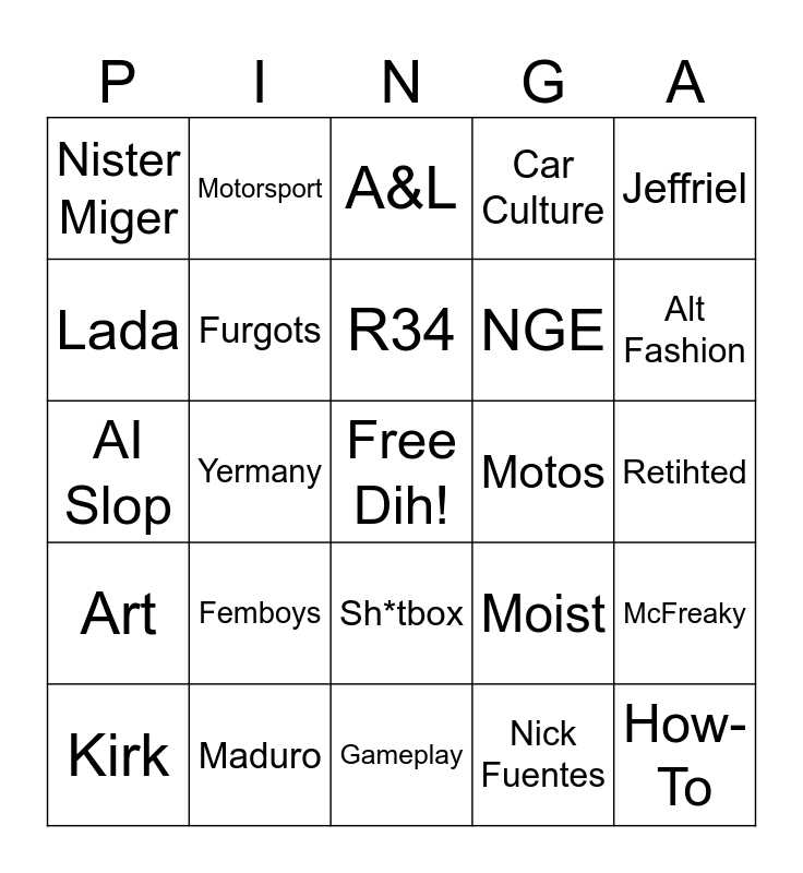 This bingo card has a free space and 24 words: Femboys, Maduro, R34, Kirk, Jeffriel, Nister Miger, Lada, Motorsport, Motos, Sh*tbox, NGE, AI Slop, Moist, McFreaky, Furgots, Nick Fuentes, Retihted, A&L, Alt Fashion, Yermany, How-To, Art, Car Culture and Gameplay.
