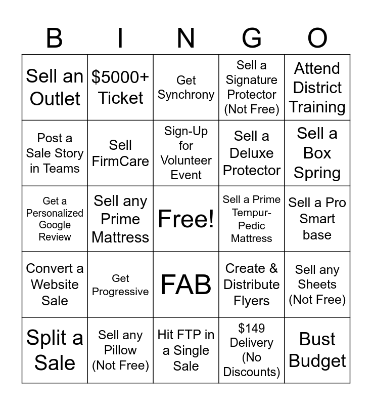 This bingo card has a free space and 24 words: Get Progressive, Sell any Pillow (Not Free), Sign-Up for Volunteer Event, Split a Sale, Attend District Training, Sell an Outlet, Post a Sale Story in Teams, $5000+ Ticket, Sell a Prime Tempur-Pedic Mattress, FAB, Sell a Deluxe Protector, Get a Personalized Google Review, Create & Distribute Flyers, Sell any Sheets (Not Free), Sell FirmCare, $149 Delivery (No Discounts), Sell a Pro Smart base, Get Synchrony, Sell a Box Spring, Sell any Prime Mattress, Bust Budget, Convert a Website Sale, Sell a Signature Protector (Not Free) and Hit FTP in a Single Sale.