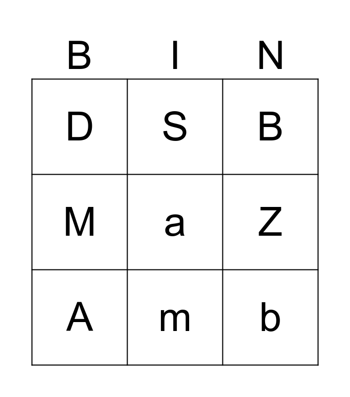 This bingo card has 9 words: A, B, S, M, D, Z, a, b and m.