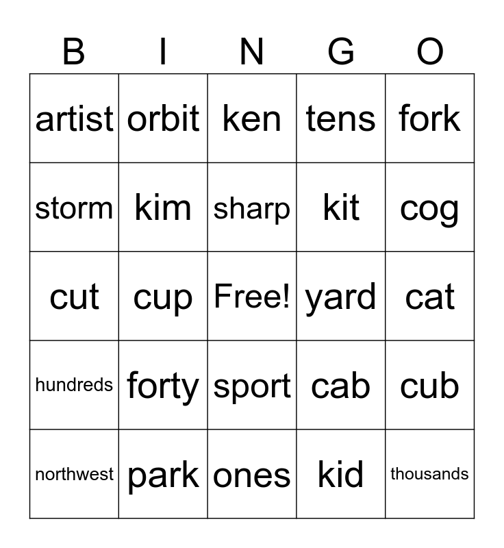 This bingo card has a free space and 24 words: forty, park, sharp, northwest, fork, artist, storm, orbit, yard, sport, kit, cut, cab, cub, kim, kid, cat, ken, cog, cup, thousands, hundreds, tens and ones.