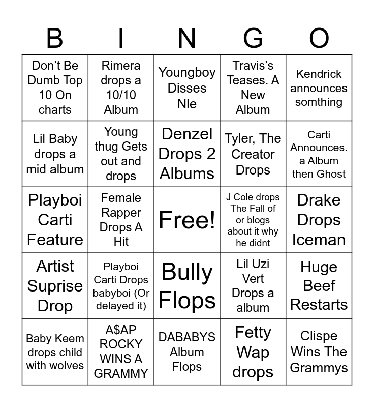 This bingo card has a free space and 24 words: Playboi Carti Drops babyboi (Or delayed it), A$AP ROCKY WINS A GRAMMY, Denzel Drops 2 Albums, Baby Keem drops child with wolves, Kendrick announces somthing, Don’t Be Dumb Top 10 On charts, Lil Baby drops a mid album, Rimera drops a 10/10 Album, J Cole drops The Fall of or blogs about it why he didnt, Bully Flops, Tyler, The Creator Drops, Playboi Carti Feature, Lil Uzi Vert Drops a album, Huge Beef Restarts, Young thug Gets out and drops, Fetty Wap drops, Drake Drops Iceman, Youngboy Disses Nle, Carti Announces. a Album then Ghost, Female Rapper Drops A Hit, Clispe Wins The Grammys, Artist Suprise Drop, Travis’s Teases. A New Album and DABABYS Album Flops.