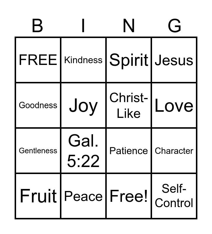 This bingo card has 17 words: Free!, Fruit, Spirit, FREE, Gal. 5:22, Jesus, Character, Christ- Like, Love, Joy, Peace, Patience, Goodness, Kindness, Gentleness, Faithfulness and Self-Control.