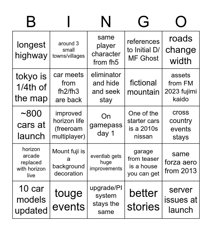 This bingo card has a free space and 24 words: Mount fuji is a background decoration, touge events, eliminator and hide and seek stay, 10 car models updated, roads change width, longest highway, tokyo is 1/4th of the map, around 3 small towns/villages, One of the starter cars is a 2010s nissan, eventlab gets huge improvements, fictional mountain, ~800 cars at launch, garage from teaser is a house you can get, same forza aero from 2013, car meets from fh2/fh3 are back, better stories, cross country events stays, same player character from fh5, assets from FM 2023 fujimi kaido, improved horizon life (freeroam multiplayer), server issues at launch, horizon arcade replaced with horizon live, references to Initial D/ MF Ghost and upgrade/PI system stays the same.
