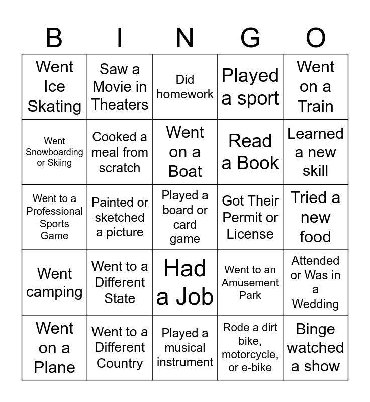 This bingo card has a free space and 24 words: Went to a Different State, Went to a Different Country, Went on a Boat, Went on a Plane, Went on a Train, Went Ice Skating, Went Snowboarding or Skiing, Saw a Movie in Theaters, Got Their Permit or License, Had a Job, Read a Book, Went to a Professional Sports Game, Went to an Amusement Park, Attended or Was in a Wedding, Cooked a meal from scratch, Rode a dirt bike, motorcycle, or e-bike, Tried a new food, Did homework, Learned a new skill, Painted or sketched a picture, Binge watched a show, Went camping, Played a sport and Played a musical instrument.