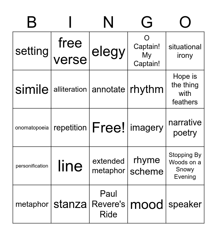 This bingo card has a free space and 24 words: line, stanza, annotate, metaphor, situational irony, setting, simile, free verse, imagery, extended metaphor, rhythm, onomatopoeia, rhyme scheme, Stopping By Woods on a Snowy Evening, alliteration, mood, narrative poetry, elegy, Hope is the thing with feathers, repetition, speaker, personification, O Captain! My Captain! and Paul Revere's Ride.