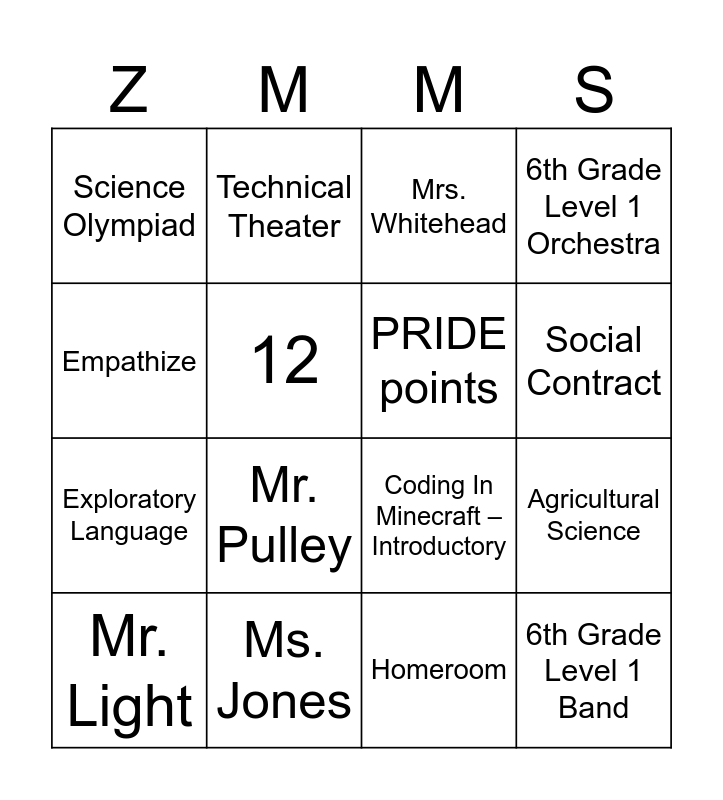 This bingo card has 24 words: Center for STEM and Advanced Studies / Gifted & Talented, Football, Social Contract, Project Invent, Empathize, Science Olympiad, 12, Technical Theater, Ms. Jones, Painting I, Exploratory Language, Coding In Minecraft – Introductory, Self-Discovery and Career Design, Infinite Campus, PRIDE points, Grade level counselor, Homeroom, Mrs. Whitehead, Mr. Pulley, Agricultural Science, Mr. Light, 6th Grade Level 1 Band, 6th Grade Level 1 Orchestra and Eastern Area Champions.