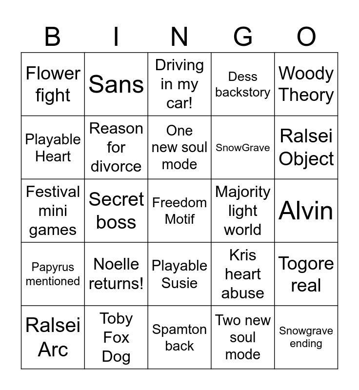 This bingo card has a free space and 24 words: Noelle returns!, Toby Fox Dog, One new soul mode, Ralsei Arc, Woody Theory, Flower fight, Playable Heart, Sans, Majority light world, Playable Susie, SnowGrave, Festival mini games, Kris heart abuse, Togore real, Reason for divorce, Two new soul mode, Alvin, Driving in my car!, Ralsei Object, Secret boss, Snowgrave ending, Papyrus mentioned, Dess backstory and Spamton back.
