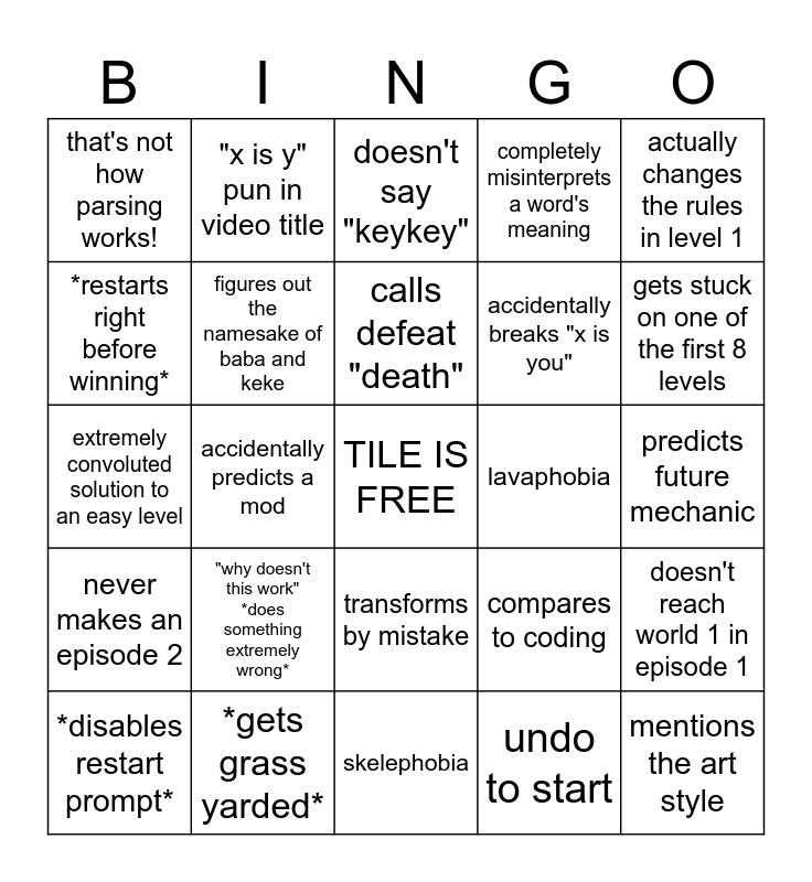 This bingo card has a free space and 26 words: transforms by mistake, undo to start, calls defeat "death", *gets grass yarded*, actually changes the rules in level 1, that's not how parsing works!, *restarts right before winning*, "x is y" pun in video title, predicts future mechanic, compares to coding, accidentally breaks "x is you", extremely convoluted solution to an easy level, doesn't reach world 1 in episode 1, *disables restart prompt*, accidentally predicts a mod, intentionally breaks "x is you", completely misinterprets a word's meaning, never makes an episode 2, doesn't say "keykey", mentions the art style, gets stuck on one of the first 8 levels, skelephobia, lavaphobia, "why doesn't this work" *does something extremely wrong*, figures out the namesake of baba and keke and spends over 20 minutes on one level.