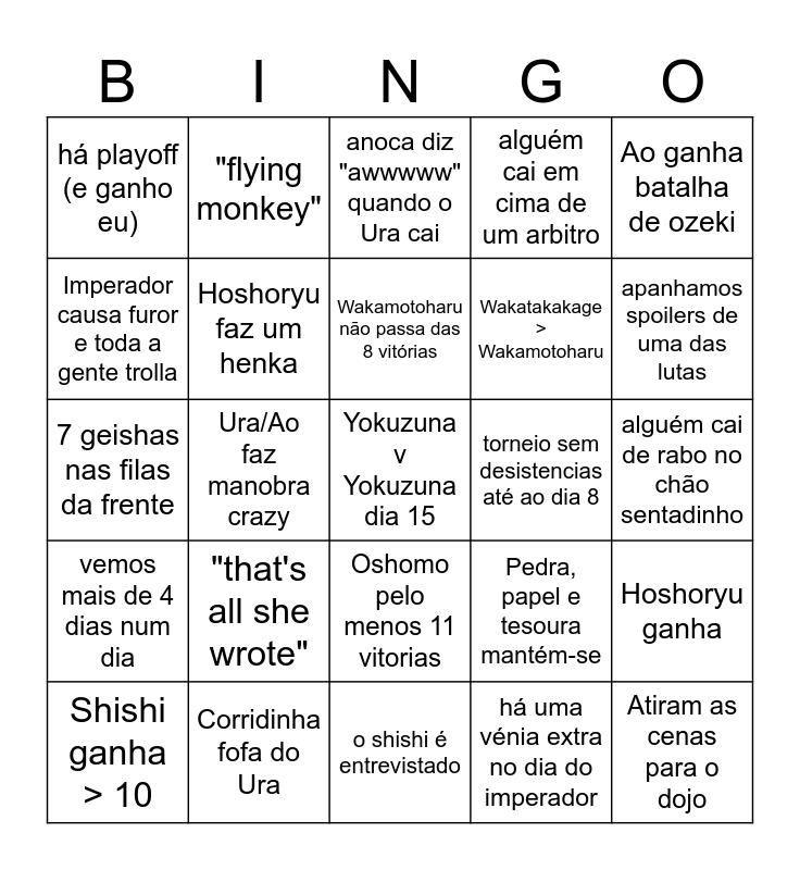 This bingo card has a free space and 24 words: "that's all she wrote", Corridinha fofa do Ura, Wakamotoharu não passa das 8 vitórias, Shishi ganha > 10, Ao ganha batalha de ozeki, há playoff (e ganho eu), Imperador causa furor e toda a gente trolla, "flying monkey", torneio sem desistencias até ao dia 8, Oshomo pelo menos 11 vitorias, Wakatakakage > Wakamotoharu, 7 geishas nas filas da frente, Pedra, papel e tesoura mantém-se, Hoshoryu ganha, Hoshoryu faz um henka, há uma vénia extra no dia do imperador, alguém cai de rabo no chão sentadinho, anoca diz "awwwww" quando o Ura cai, apanhamos spoilers de uma das lutas, Ura/Ao faz manobra crazy, Atiram as cenas para o dojo, vemos mais de 4 dias num dia, alguém cai em cima de um arbitro and o shishi é entrevistado.