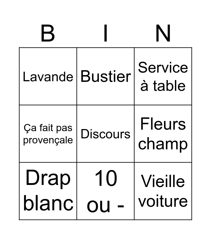 This bingo card has a free space and 8 words: Fleurs champ, Service à table, Bustier, Drap blanc, Lavande, Vieille voiture, Ça fait pas provençale and 10 ou -.