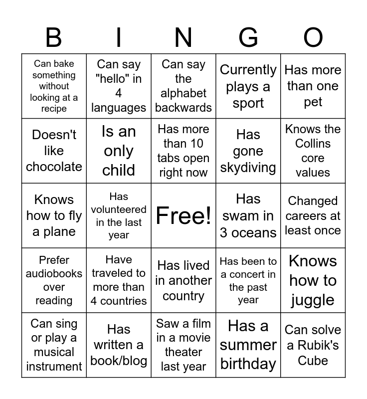 This bingo card has a free space and 24 words: Have traveled to more than 4 countries, Has written a book/blog, Has more than 10 tabs open right now, Can sing or play a musical instrument, Has more than one pet, Can bake something without looking at a recipe, Doesn't like chocolate, Can say "hello" in 4 languages, Has swam in 3 oceans, Has lived in another country, Has gone skydiving, Knows how to fly a plane, Has been to a concert in the past year, Knows how to juggle, Is an only child, Has a summer birthday, Changed careers at least once, Can say the alphabet backwards, Knows the Collins core values, Has volunteered in the last year, Can solve a Rubik's Cube, Prefer audiobooks over reading, Currently plays a sport and Saw a film in a movie theater last year.