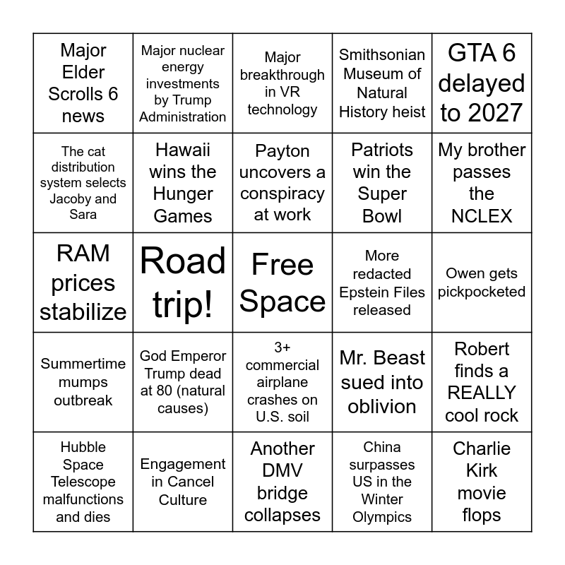 This bingo card has a free space and 24 words: God Emperor Trump dead at 80 (natural causes), Engagement in Cancel Culture, Payton uncovers a conspiracy at work, Hubble Space Telescope malfunctions and dies, GTA 6 delayed to 2027, Major Elder Scrolls 6 news, The cat distribution system selects Jacoby and Sara, Major nuclear energy investments by Trump Administration, More redacted Epstein Files released, 3+ commercial airplane crashes on U.S. soil, Patriots win the Super Bowl, RAM prices stabilize, Mr. Beast sued into oblivion, Robert finds a REALLY cool rock, Hawaii wins the Hunger Games, China surpasses US in the Winter Olympics, Owen gets pickpocketed, Major breakthrough in VR technology, My brother passes the NCLEX, Road trip!, Charlie Kirk movie flops, Summertime mumps outbreak, Smithsonian Museum of Natural History heist and Another DMV bridge collapses.