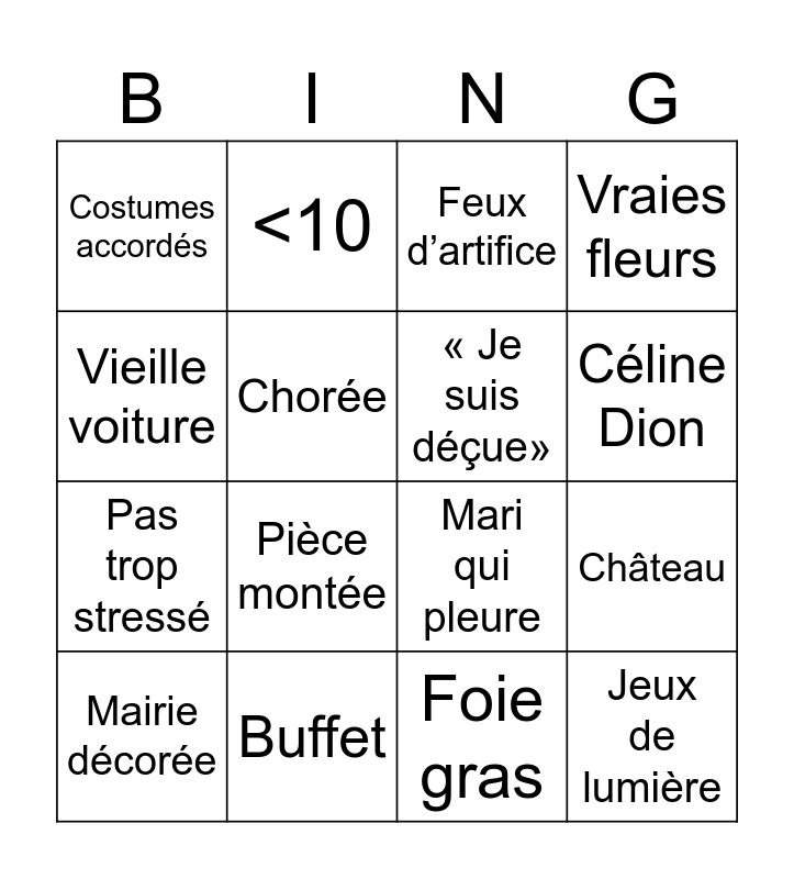 This bingo card has 16 words: Buffet, Château, Feux d’artifice, Costumes accordés, Pas trop stressé, <10, Mari qui pleure, Foie gras, Vieille voiture, Chorée, Mairie décorée, Vraies fleurs, Pièce montée, Céline Dion, « Je suis déçue» and Jeux de lumière.