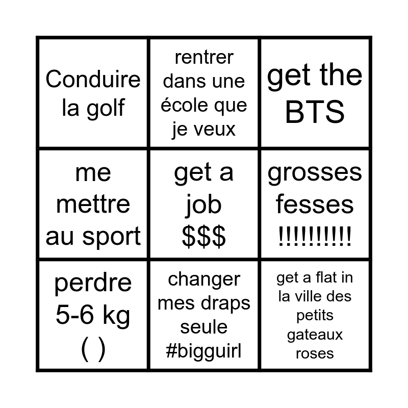 This bingo card has 9 words: perdre 5-6 kg ( ), get the BTS, rentrer dans une école que je veux, me mettre au sport, Conduire la golf, grosses fesses !!!!!!!!!!, get a job $$$, get a flat in la ville des petits gateaux roses and changer mes draps seule #bigguirl.