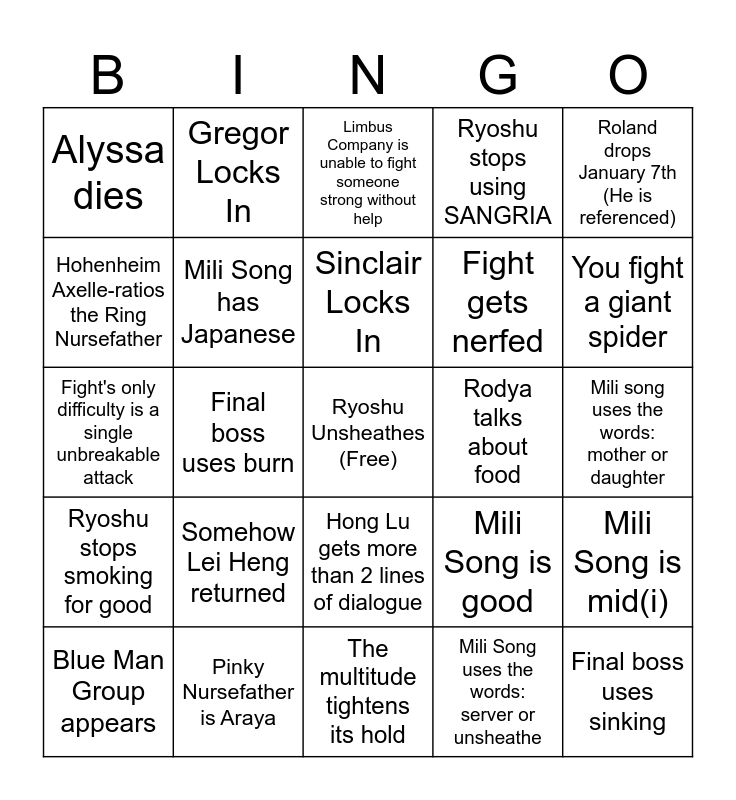 This bingo card has a free space and 24 words: Somehow Lei Heng returned, Pinky Nursefather is Araya, Sinclair Locks In, Blue Man Group appears, Roland drops January 7th (He is referenced), Alyssa dies, Hohenheim Axelle-ratios the Ring Nursefather, Gregor Locks In, Rodya talks about food, Hong Lu gets more than 2 lines of dialogue, Fight gets nerfed, Fight's only difficulty is a single unbreakable attack, Mili Song is good, Mili Song is mid(i), Mili Song has Japanese, Mili Song uses the words: server or unsheathe, Mili song uses the words: mother or daughter, Limbus Company is unable to fight someone strong without help, You fight a giant spider, Final boss uses burn, Final boss uses sinking, Ryoshu stops smoking for good, Ryoshu stops using SANGRIA and The multitude tightens its hold.
