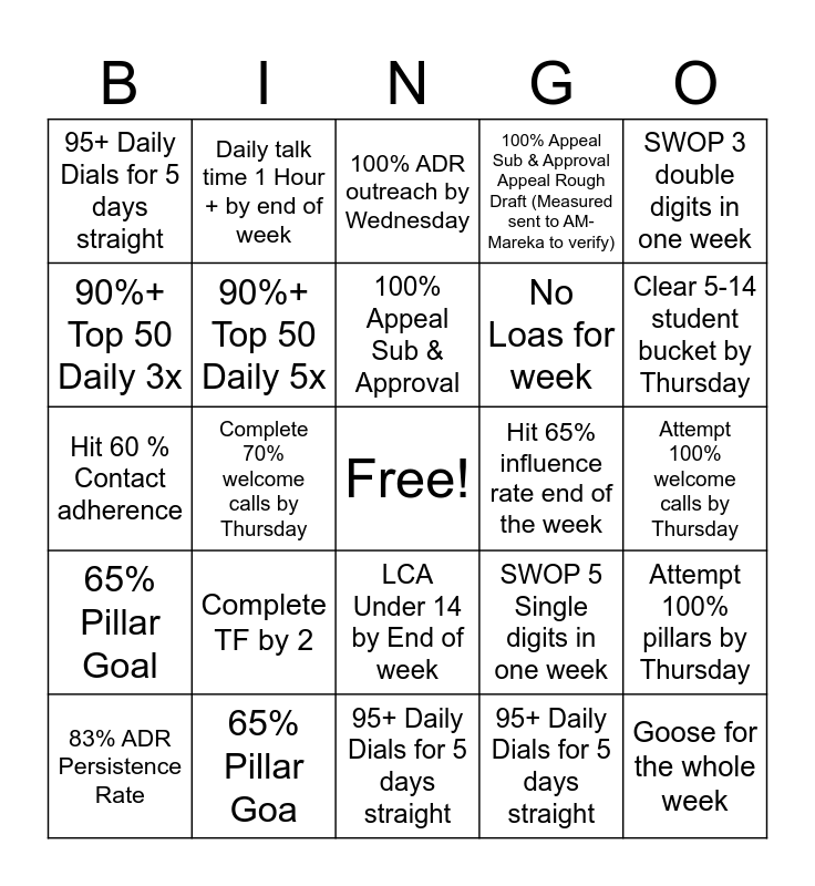 This bingo card has a free space and 24 words: Complete TF by 2, 65% Pillar Goa, 100% Appeal Sub & Approval, 83% ADR Persistence Rate, SWOP 3 double digits in one week, 95+ Daily Dials for 5 days straight, 90%+ Top 50 Daily 3x, Daily talk time 1 Hour + by end of week, Hit 65% influence rate end of the week, LCA Under 14 by End of week, No Loas for week, Hit 60 % Contact adherence, SWOP 5 Single digits in one week, Attempt 100% pillars by Thursday, 90%+ Top 50 Daily 5x, 95+ Daily Dials for 5 days straight, Attempt 100% welcome calls by Thursday, 100% ADR outreach by Wednesday, Clear 5-14 student bucket by Thursday, Complete 70% welcome calls by Thursday, Goose for the whole week, 65% Pillar Goal, 100% Appeal Sub & Approval Appeal Rough Draft (Measured sent to AM-Mareka to verify) and 95+ Daily Dials for 5 days straight.