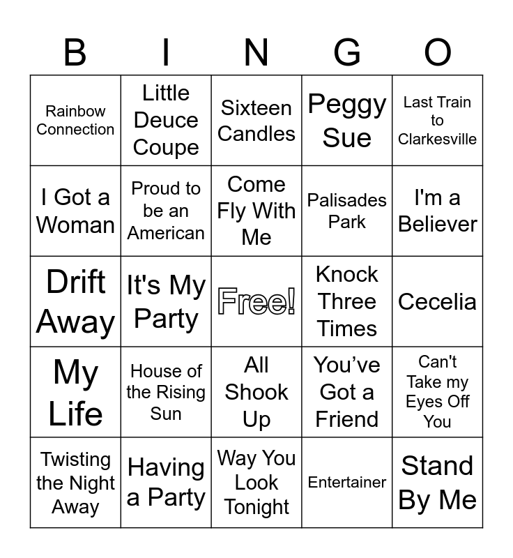 This bingo card has a free space and 86 words: Accentuate the Positive, All My Lovin, All Shook Up, American Pie, Baby I Need Your Lovin’, Bare Necessities, Beyond the Sea, Blue Suede Shoes, Boogie Boogie Bugle Boy, Brandy, Brown Eyed Girl, Bye Bye Love, Can't Take my Eyes Off You, Cecelia, Chapel of Love, Come Fly With Me, Country Roads, Dancing in the Moonlight, Darktown Strutters Ball, Daydream Believer, Do Re Mi, Dock of the Bay, Drift Away, Earth Angel, Entertainer, Five Foot Two (Eyes of Blue), Fun Fun Fun, Get Down Tonight, Good Lovin, Hang On Snoopy, Having a Party, Help Me Rhonda, Hey Good Looking, House of the Rising Sun, I Got a Woman, I Left My Heart In San Francisco, I'm a Believer, If You Wanna Be Happy, In The Still of the Night, It's My Party, It’s a Small World, Jailhouse Rock, Joy To the World, Knock Three Times, La Bamba, Last Train to Clarkesville, Little Bitty Pretty One, Little Deuce Coupe, Love Grows, Luck Be a Lady, Minnie The Moocher, Mustang Sally, My Life, Ob-La-Di Ob-La-Da (Life Goes On), Oh What a Night (December 1963), Old Time Rock & Roll, On The Sunny Side of the Street, Palisades Park, Peggy Sue, Proud to be an American, Rainbow Connection, Ring of Fire, Rockin Robin, Runaround Sue, Save the Last Dance for Me, Sixteen Candles, Somewhere Over the Rainbow, Stand By Me, Sway, Take this Job and Shove it, Tracks of my Tears, Twist, Twisting the Night Away, Under the Boardwalk, Wake Up Little Susie, Waterloo, Way You Look Tonight, When the Saints Go Marching In, Whole Lotta Shakin Goin On, Wooly Bully, Y.M.C.A., Yesterday, You Can’t Hurry Love, You Send Me, You’ve Got a Friend and Your Song.