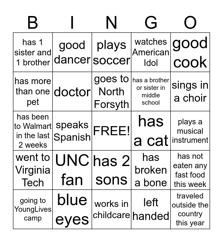 This bingo card has a free space and 24 words: UNC fan, blue eyes, goes to North Forsyth, going to YoungLives camp, good cook, has 1 sister and 1 brother, has more than one pet, good dancer, has a cat, has 2 sons, has a brother or sister in middle school, has been to Walmart in the last 2 weeks, has broken a bone, has not eaten any fast food this week, doctor, left handed, plays a musical instrument, plays soccer, sings in a choir, speaks Spanish, traveled outside the country this year, went to Virginia Tech, watches American Idol and works in childcare.