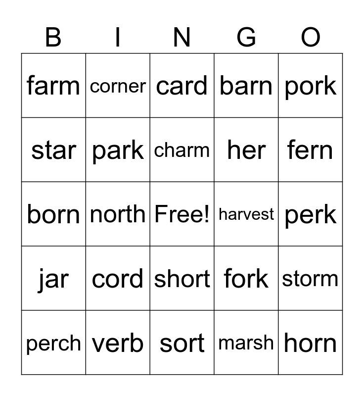 This bingo card has a free space and 24 words: cord, verb, charm, perch, pork, farm, star, corner, harvest, short, her, born, fork, storm, park, marsh, perk, card, fern, north, horn, jar, barn and sort.