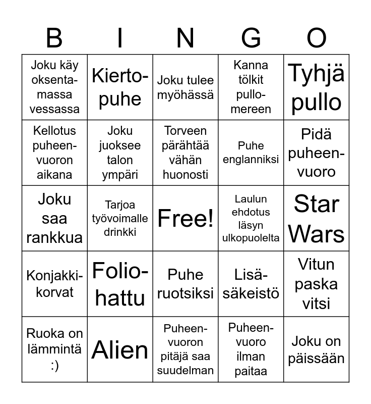 This bingo card has a free space and 24 words: Folio- hattu, Alien, Torveen pärähtää vähän huonosti, Ruoka on lämmintä :), Tyhjä pullo, Joku käy oksenta-massa vessassa, Kellotus puheen- vuoron aikana, Kierto- puhe, Laulun ehdotus läsyn ulkopuolelta, Puhe ruotsiksi, Puhe englanniksi, Joku saa rankkua, Lisä- säkeistö, Vitun paska vitsi, Joku juoksee talon ympäri, Puheen- vuoro ilman paitaa, Star Wars, Joku tulee myöhässä, Pidä puheen-vuoro, Tarjoa työvoimalle drinkki, Joku on päissään, Konjakki-korvat, Kanna tölkit pullo- mereen and Puheen-vuoron pitäjä saa suudelman.