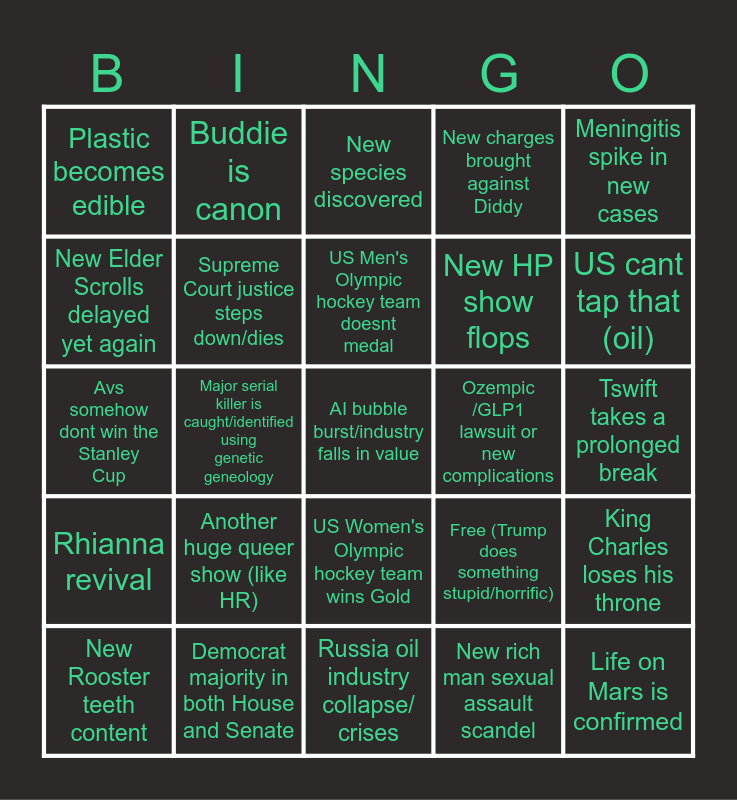 This bingo card has 25 words: Another huge queer show (like HR), Russia oil industry collapse/ crises, US Men's Olympic hockey team doesnt medal, New Rooster teeth content, Meningitis spike in new cases, Plastic becomes edible, New Elder Scrolls delayed yet again, Buddie is canon, Ozempic /GLP1 lawsuit or new complications, US Women's Olympic hockey team wins Gold, New HP show flops, Avs somehow dont win the Stanley Cup, Free (Trump does something stupid/horrific), King Charles loses his throne, Supreme Court justice steps down/dies, Life on Mars is confirmed, Tswift takes a prolonged break, New species discovered, US cant tap that (oil), Major serial killer is caught/identified using genetic geneology, AI bubble burst/industry falls in value, Democrat majority in both House and Senate, Rhianna revival, New charges brought against Diddy and New rich man sexual assault scandel.