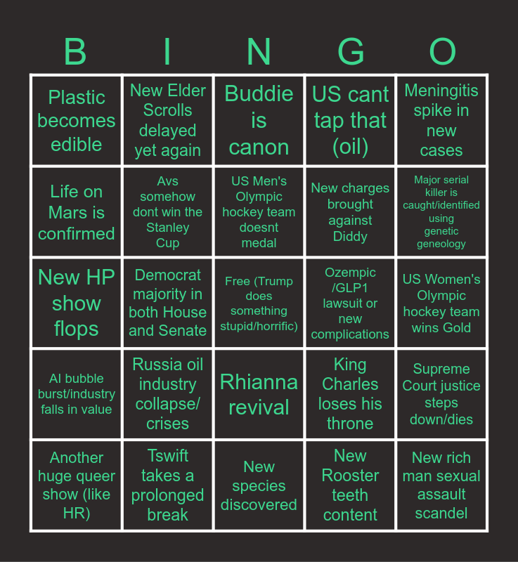 This bingo card has a free space and 24 words: Another huge queer show (like HR), Russia oil industry collapse/ crises, US Men's Olympic hockey team doesnt medal, New Rooster teeth content, Meningitis spike in new cases, Plastic becomes edible, New Elder Scrolls delayed yet again, Buddie is canon, Ozempic /GLP1 lawsuit or new complications, US Women's Olympic hockey team wins Gold, New HP show flops, Avs somehow dont win the Stanley Cup, King Charles loses his throne, Supreme Court justice steps down/dies, Life on Mars is confirmed, Tswift takes a prolonged break, New species discovered, US cant tap that (oil), Major serial killer is caught/identified using genetic geneology, AI bubble burst/industry falls in value, Democrat majority in both House and Senate, Rhianna revival, New charges brought against Diddy and New rich man sexual assault scandel.