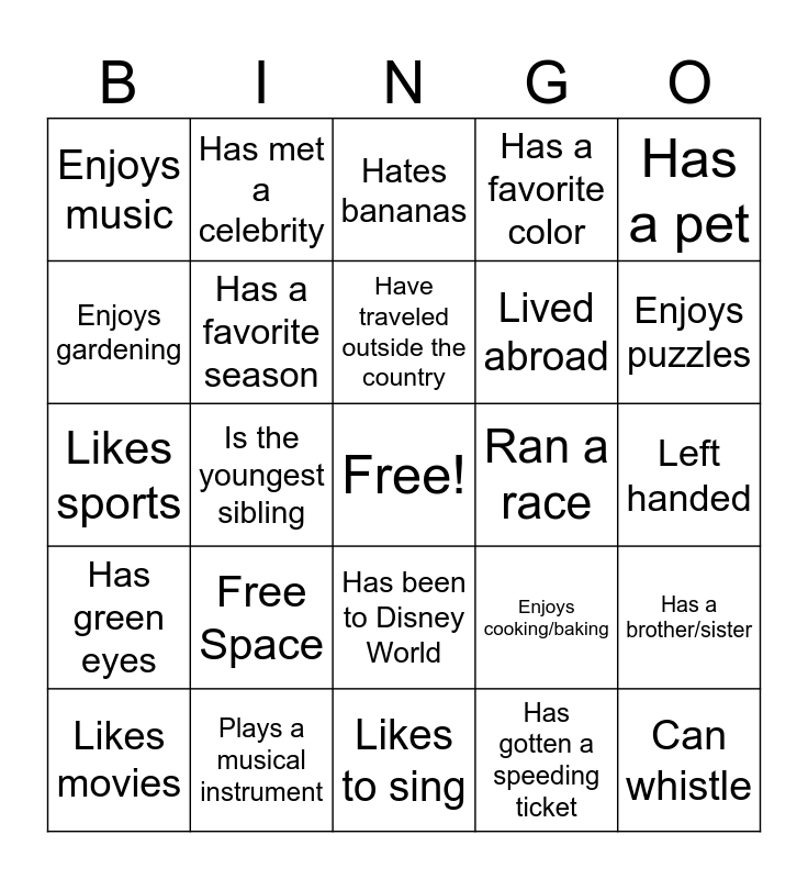This bingo card has a free space and 25 words: Free Space, Likes to sing, Have traveled outside the country, Likes movies, Has a pet, Enjoys music, Enjoys gardening, Has met a celebrity, Ran a race, Has been to Disney World, Lived abroad, Likes sports, Enjoys cooking/baking, Has a brother/sister, Has a favorite season, Has grandchildren, Left handed, Hates bananas, Enjoys puzzles, Is the youngest sibling, Can whistle, Plays a musical instrument, Has green eyes, Has a favorite color and Has gotten a speeding ticket.